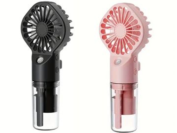 Batteridriven handfläkt med ånga. Laddas via USB. Finns i två färger, rosa och svart.